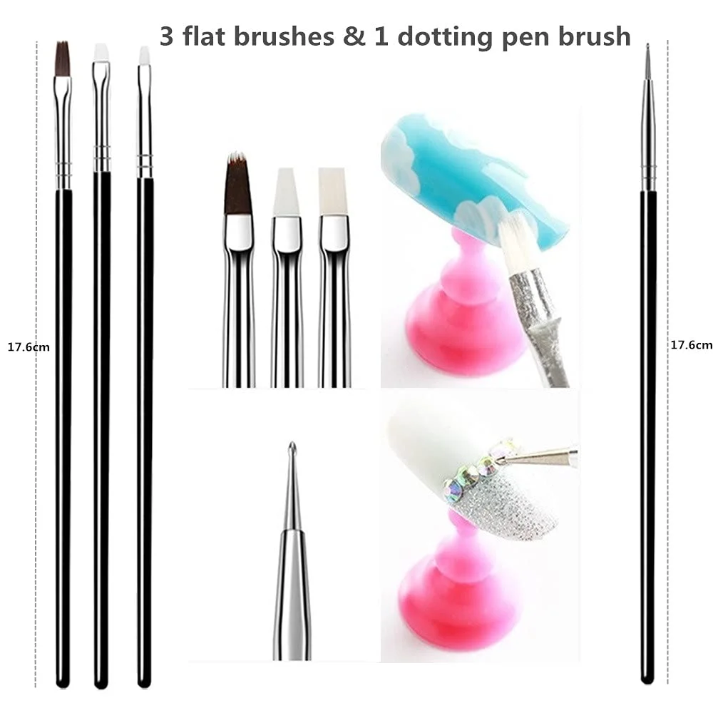 1.Professional Nail Art Accessories: 15pcs nail art painting brush set, 5pcs 2-way drawing dotting painting pens, make your own nail art styles. 2.Material: alloy (mouth tube) + resin (pen holder) + acrylic (pen holder) + fiber wool (pen holder) 3.Brushes Length: 12.5-18.5cm (4.9-7.3inch); Dotting Pen Length: 13cm(5.1inch); Plastic handle length: 10 cm(3.9inch); Dotting pen color: green, yellow, white, pink, blue. 4.15pcs Nail Art Brushes Set: 2 Flat Fan Brushes; 1 Angled Head Brush; 1 Pattern Brush; 2 Liner Brushes; 3 Flat Brushes; 3 Oblique Brushes; 1 Dotting Pen Brush; 1 Drawing Brush; 1 Petal Brush. Covers the range of brushes you'll need, different brushes for different functions, some for dotting flowers, and others for drawing lines or painting. 5.Double-ended Nail Dotting Pens: each is end with a large ball and another end with a small ball for various size dotting.